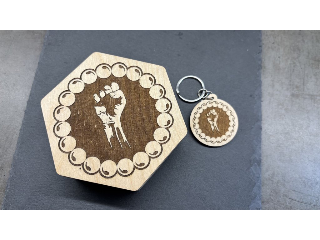 Sada dřevěné krabičky a klíčenky ve stejném designu. Krabička je vhodná na klasické herní kostky.